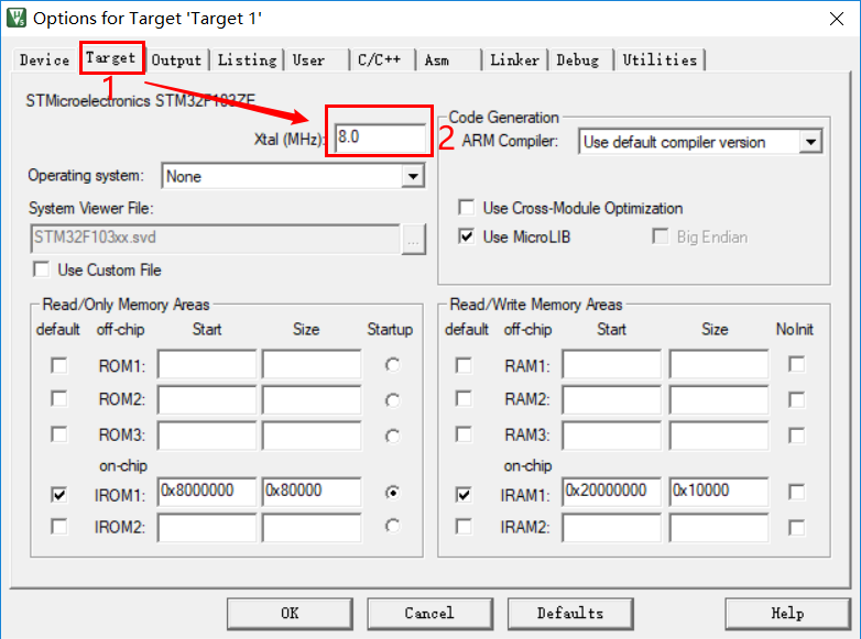 3、进入Target并在晶振(Xtal)中填入板子外部晶振参数。