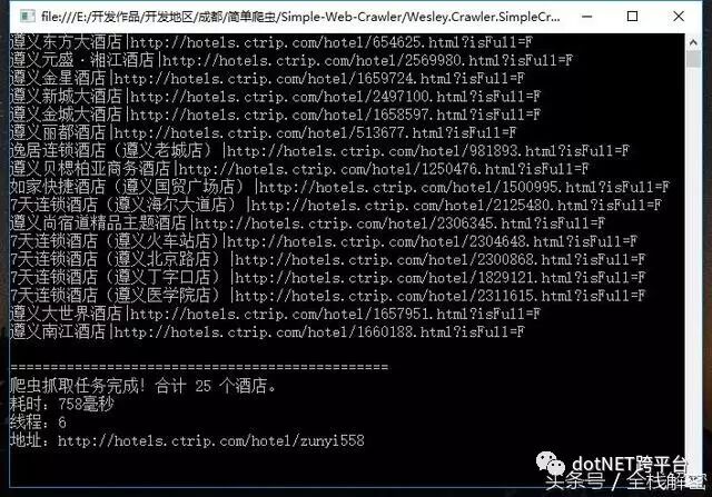 为了加快爬虫的速度,我又增加了Gzip解压缩的功能,由于不太便于截图,大家可以在源代码里查看。现在我们用这个爬虫抓取一下携程网的酒店数据,看看效果如何。