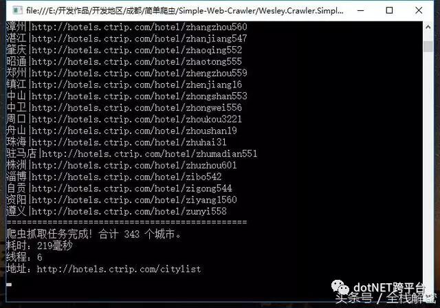 代码都很简单,眼睛犀利的朋友肯定看到了我在cityCrawler.Start()方法中使用了代理服务器,那个参数是可选的。经测试代理IP的速度还不错,唯一不足的地方可能就是偶尔会出现连接超时,并发量少时并不需要开代理,这里只是为了测试的需要。来看看执行情况: