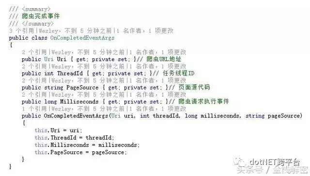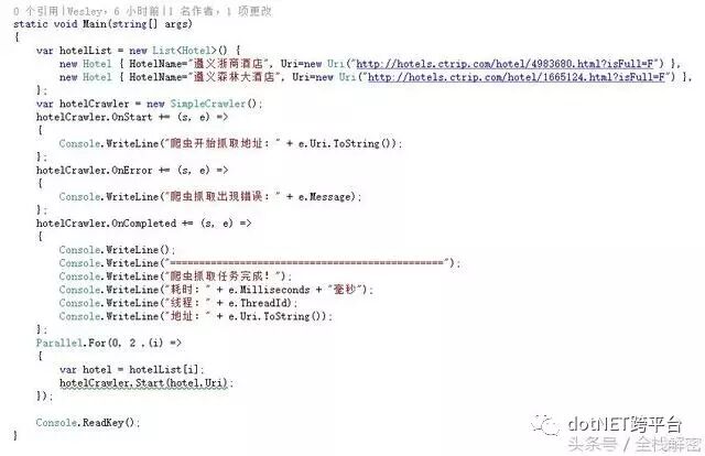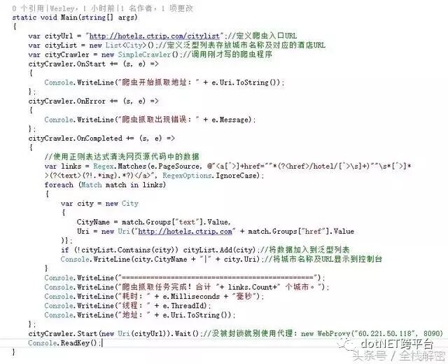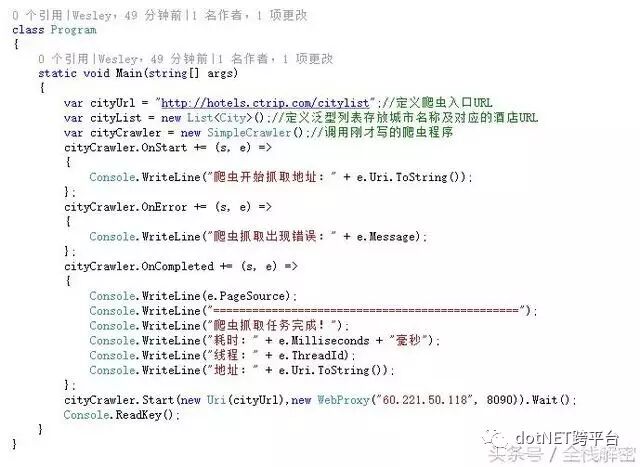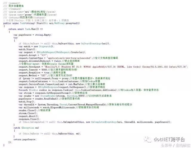 最后我们再给它增加一个异步方法,通过User-Agent将爬虫伪装成了Chrome浏览器,代码中每行我基本都加了注释,学过.NET的朋友一看就明白,这里就不再重复解释了: