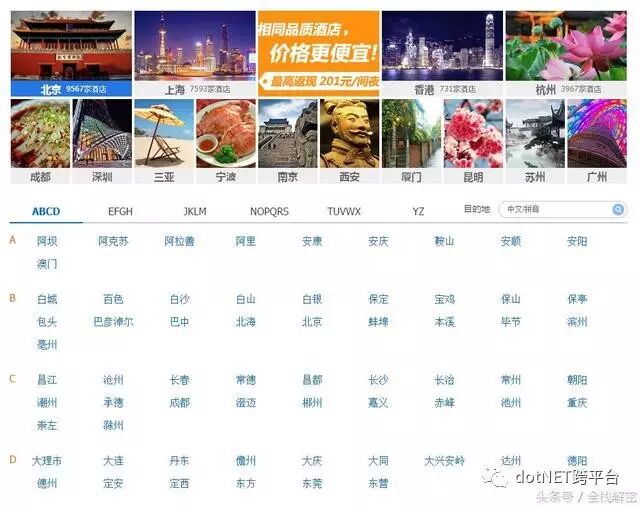 携程的酒店是按城市归类的,从每个城市又链接到了下属所有酒店,国内的城市大约有300多个,仅北京一个市的酒店数据就有9000多个,所以我要先抓下边这页面里的城市名称及城市URL地址。