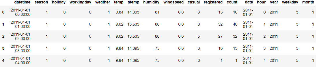 from datetime import datetime dataDaily["date"] = dataDaily.datetime.apply(lambda x: x.split()[0]) dataDaily["hour"] = dataDaily.datetime.apply(lambda x: x.split()[1].split(":")[0]).astype("int") dataDaily["year"] = dataDaily.datetime.apply(lambda x: x.split()[0].split("-")[0]) dataDaily["weekday"] = dataDaily.date.apply(lambda x: datetime.strptime(x, "%Y-%m-%d").weekday()) dataDaily["month"] = dataDaily.date.apply(lambda x: datetime.strptime(x, "%Y-%m-%d").month)