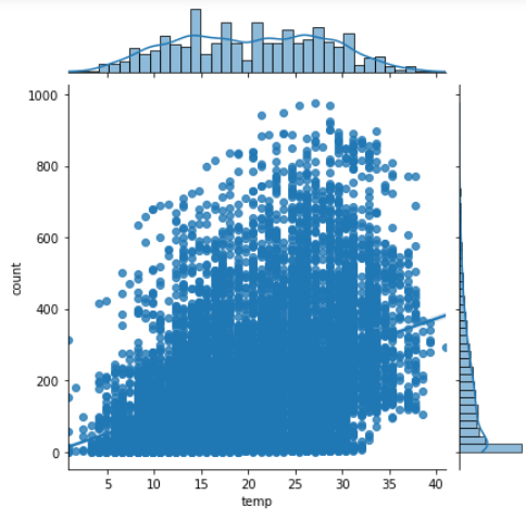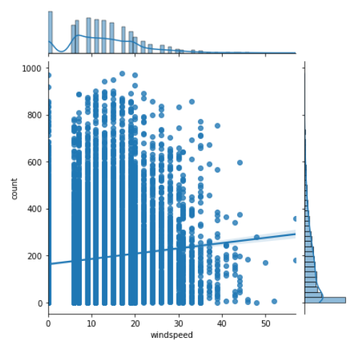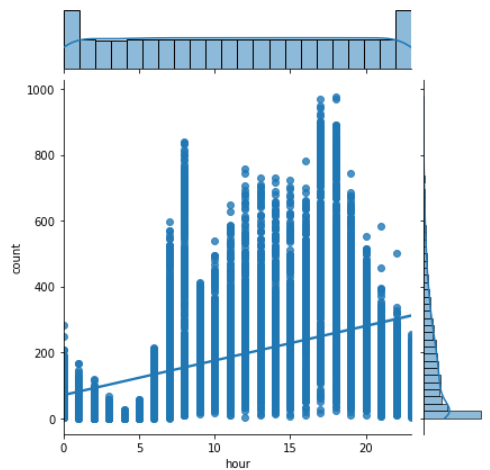 #绘制count vs temp ,humidity windspeed,hour的回归图 sn.jointplot(x='temp',y='count',data=dataDaily,kind='reg') sn.jointplot(x='humidity',y='count',data=dataDaily,kind='reg') sn.jointplot(x='windspeed',y='count',data=dataDaily,kind='reg') sn.jointplot(x='hour',y='count',data=dataDaily,kind='reg')