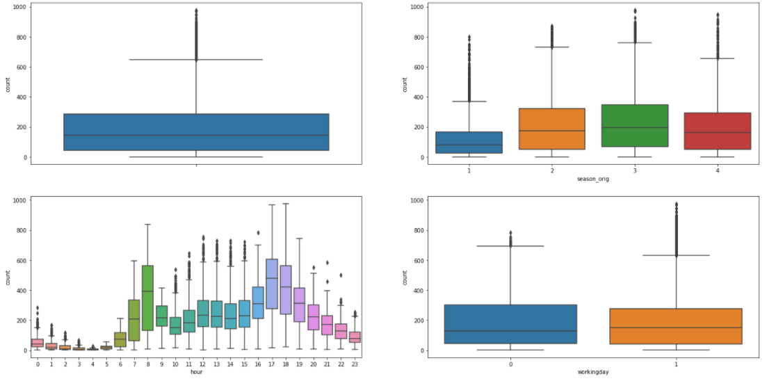 fig,axes=plt.subplots(2,2) fig.set_size_inches(24,12) sn.boxplot(data=dataDaily,y='count',ax=axes[0][0]) sn.boxplot(data=dataDaily,y='count',x='season_orig',ax=axes[0][1]) sn.boxplot(data=dataDaily,y='count',x='hour',ax=axes[1][0]) sn.boxplot(data=dataDaily,y='count',x='workingday',ax=axes[1][1])