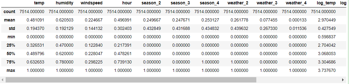 dataDaily['log_temp']=np.log1p(dataDaily.temp) dataDaily['log_windspeed']=np.log1p(dataDaily.windspeed) dataDaily['log_humidity']=np.log1p(dataDaily.humidity) dataDaily['log_hour']=np.log1p(dataDaily.hour)