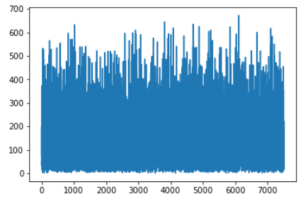 #构造验证集 dataTest=pd.concat([train_x,train_y],axis=1) #目标与数据分离,删除不必要的特征 train_x = data.copy().drop(["count"], axis=1) train_y = data["count"] test_x = dataTest.copy().drop(["count"], axis=1) test_y = dataTest["count"] #重新建模预测需求的自行车数量 #重新训练模型 lModel=LinearRegression() lModel.fit(X=train_x,y=np.log1p(train_y)) preds=lModel.predict(X=test_x) #在验证集上验证 #回归效果RMSLE评估 print('NEW RMSLE: ',round(rmsle(test_y,np.expm1(preds)),4)) #查看预测效果 plt.plot(np.expm1(preds))