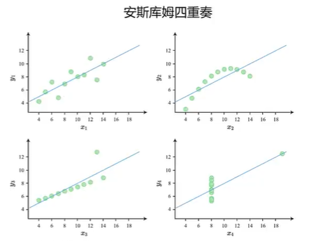 安斯库姆四重奏里的四个不同的数据集,用线性回归模型拟合出来的直线相同,这些数据的均值方差都相同,为了看出拟合的效果,我们会利用R^2等指标进行模型诊断。
