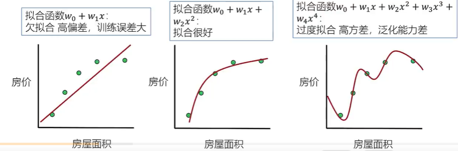 当模型变量过多时,线性回归可能会出现过度拟合问题,例如在房价预测问题中,假设x表示房屋面积,如果将x^2,x^3等独立变量引入可能会出现如下情况: