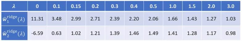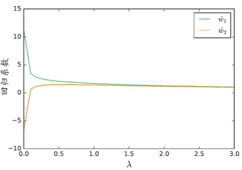 根据岭迹图做超参数lambda的选择,lambda在(0,0.5)的范围内波动较大,故需加入正则化项重新进行参数估计,可选lambda=1,一般认为是的w1和w2比较稳定时的lambda比较好。