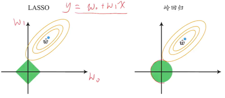 通过添加L1惩罚函数,LASSO回归可以得到角点解,即稀疏的最优解w,此时w=0,我们可以将对应的变量从模型中删除。