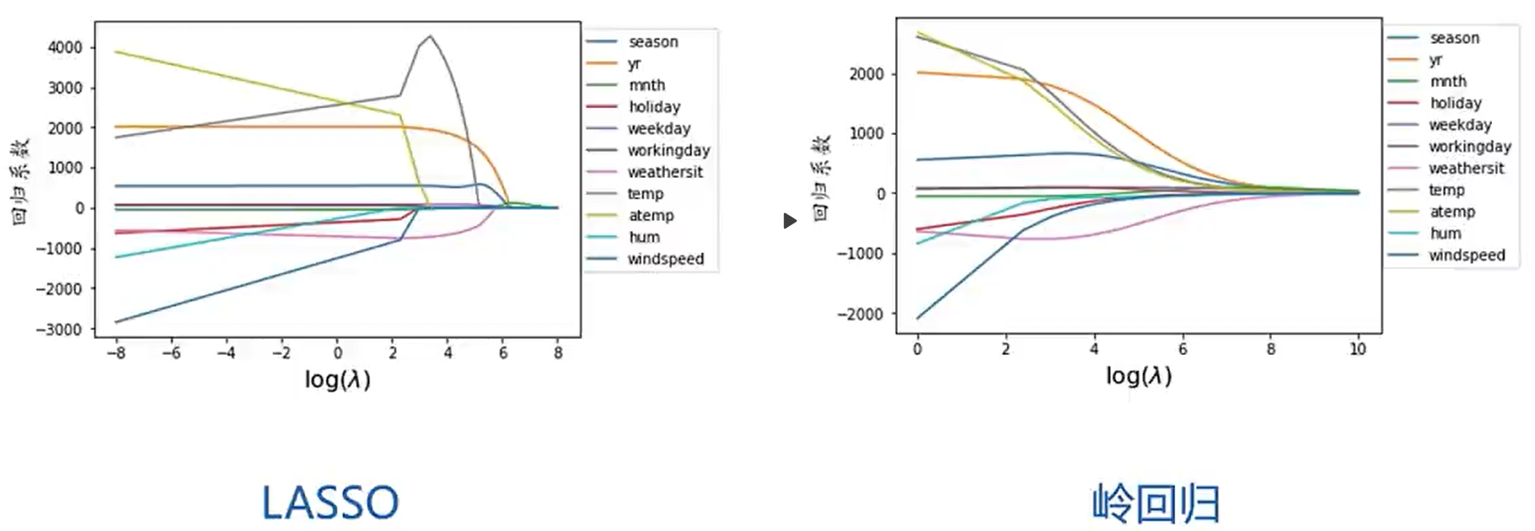 随着lambda增大,LASSO的变量系数逐个减小为0,适合做特征选择;而岭回归变量系数几乎同时趋近于0。