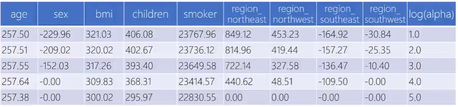 为了做出岭迹图,首先整合各惩罚系数下的各自变量系数,log(alpha)表示惩罚系数的对数值。