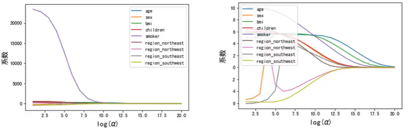 发现smoker系数相对其他系数过大,导致无法观测各系数的收敛情况,如下左图,对各系数作如下处理,可得下右图: