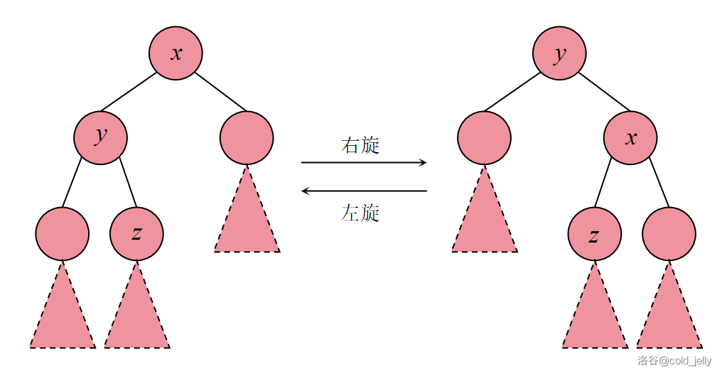 旋转分为两种,左旋(zag)和右旋(zig),它们之间的关系可以用下图展示(建议多看几遍,尝试感悟一下旋转方式):