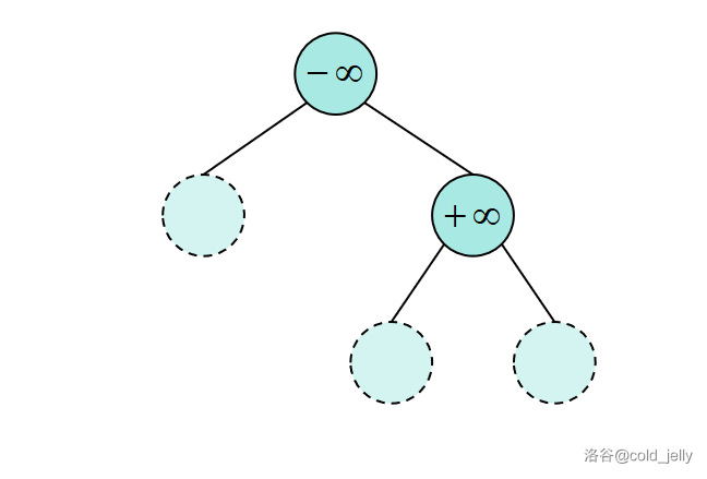 为了便于我们处理边界,我们应当在插入所有节点前先插入两个 \(key\) 值分别为 \(-\infty\) 以及 \(+\infty\) 的节点作为“哨兵”,按照 BST 性质,此时 Treap 内部是这样的: