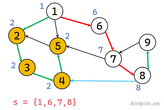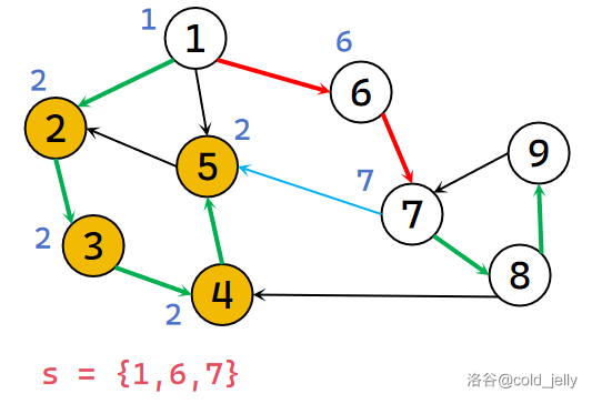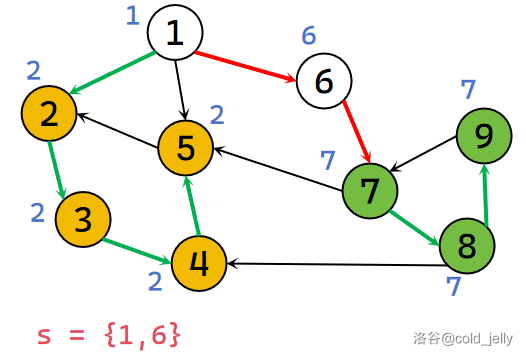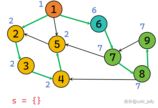 此时发现 \(low[7]=dfn[7]\) 且 \(7\) 的出边已找完,所以 \(7\) 为该强连通分量的根,不断弹出栈中元素直到 \(7\) 被弹出,此时被弹出的元素同属于一个 SCC,我们记录下来并标记颜色: