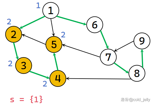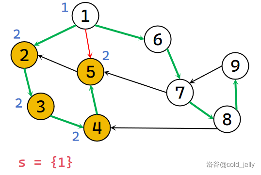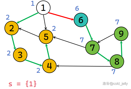 继续回溯到 \(1\),发现 \(low[1]=dfn[1]\) 且 \(1\) 的出边已找完,所以 \(1\) 为该强连通分量的根,不断弹出栈中元素直到 \(1\) 被弹出,此时被弹出的元素同属于一个 SCC,我们记录下来并标记颜色: