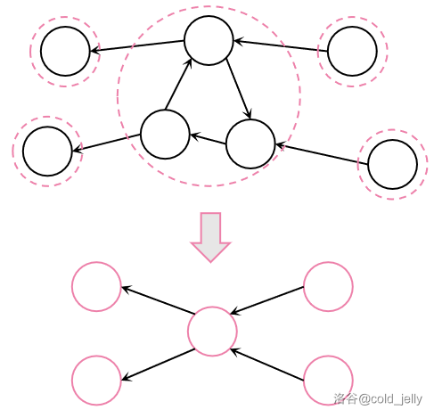 我们像下图一样把有向图上每个 SCC 看作一个“大点”,从而得到一个 DAG 的过程就叫做缩点。