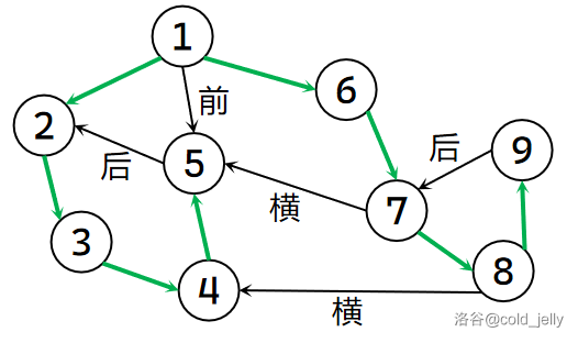 - 后向边,\(v\) 是 \(u\) 的祖先节点;