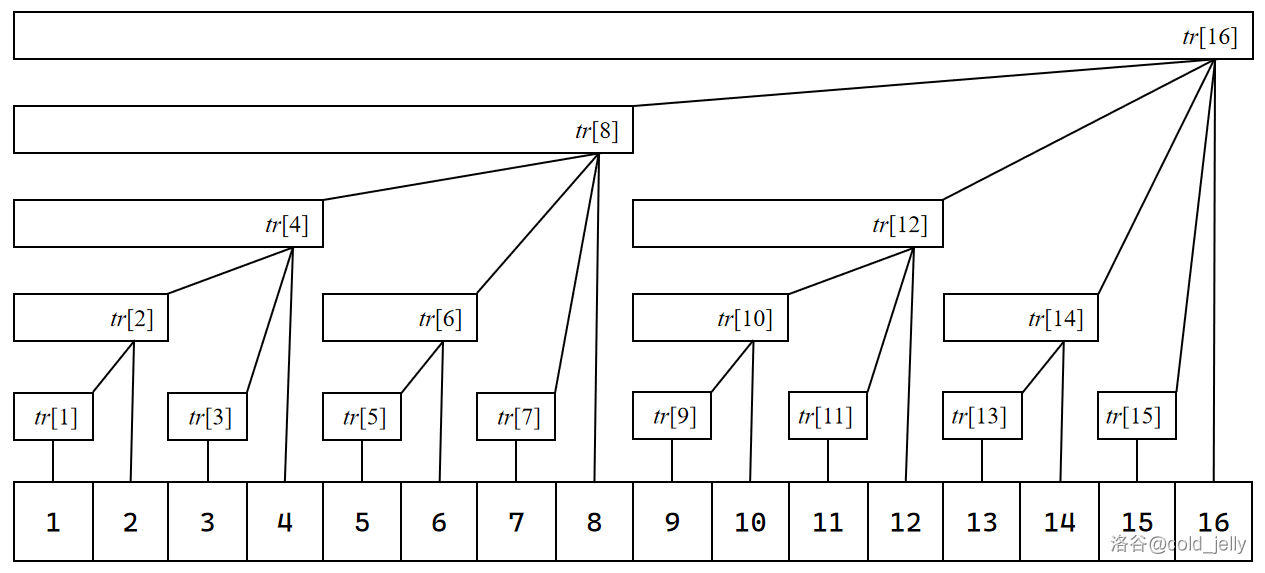 \(\text{lowbit}(x)\) 为 lowbit 函数,其值等于 \(x\&(-x)\)。这个数组 \(tr\) 可以看作上图所展示的一个树形结构,例如 \(\text{lowbit}(12)=4\),则在上图中,\(\displaystyle tr[12]=\sum^{12}_{i=9}a[i]=a[9]+a[10]+a[11]+a[12]\)。
