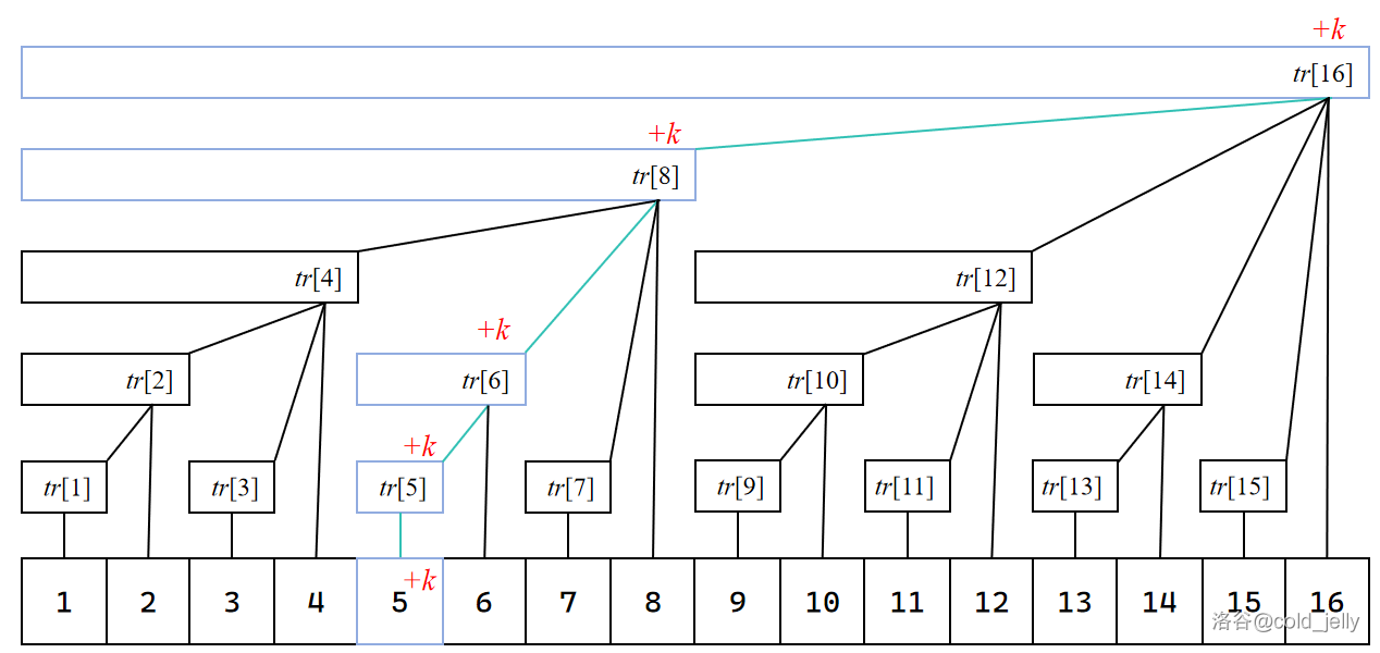 树状数组还支持单点修改,即支持在反复在原序列 \(a\) 的多个位置上分别加减数的过程中维护其前缀和。当我们将 \(a[x]\) 加 \(k\) 时,为维护前缀和,树状数组将会将 \(a[x]\) 到根节点的路径上的所有节点的权值均增加 \(k\),此时每次将下标加 \(\text{lowbit}(x)\) 即可遍历所有祖先节点了,时间复杂度也为 \(O(\log n)\)。