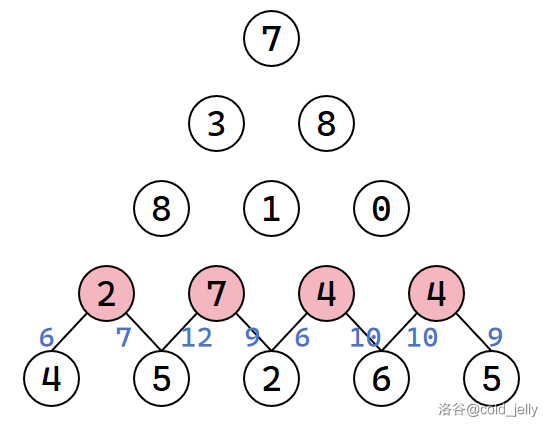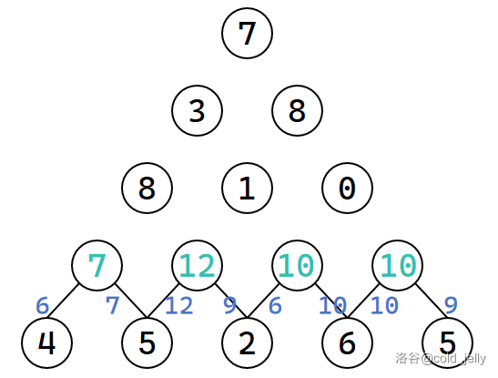 我们按照上一题的方式,可以先想到暴力搜索的做法,直接暴力枚举所有路径,复杂度显然是指数级别的。我们固然可以通过记录已求得的子问题的答案来将复杂度优化到 \(O(n^2)\),但我们不妨直接想想如何自下而上地递推求解呢?我们可以从倒数第一层开始向上扩展,每层之间的扩展即记录当前的最长路径: