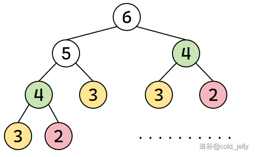 我们看看复杂度是多少,先画出递归树(树中每个节点代表斐波那契数列的项数,以 \(f(6)\) 为例):
