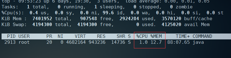 第一个标注的地方是CPU和内存占用率,后面的943100是物理内存使用量,单位是k,此时kafka大约占用943M内存