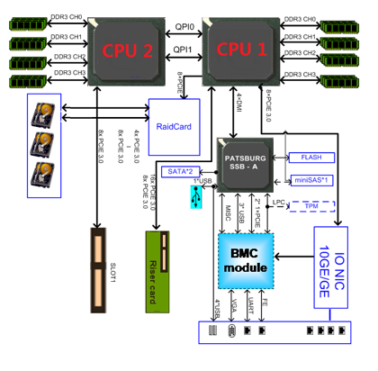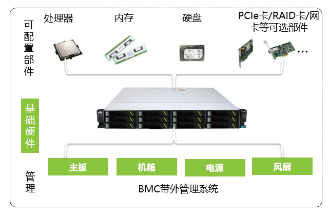 相较于日常使用的个人电脑,服务器最大的区别就是自带BMC(基板管理控制器 Baseboard Manager Controller),平台管理表示的是一系列的监视和控制功能,操作的对象是系统硬件。比如通过监视系统的温度,电压,风扇、电源等等,并做相应的调节工作,以保证系统处于健康的状态。当然如果系统真的不正常了,也可以通过复位的方式来重新启动系统。同时平台管理还负责记录各种硬件的信息和日志记录,用于提示用户和后续问题的定位。