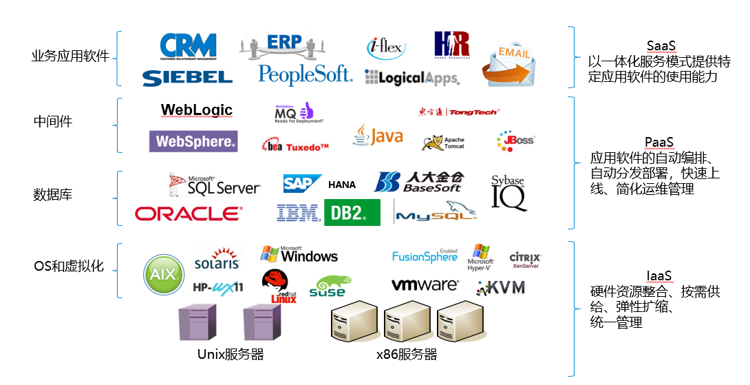 除了服务器的硬件方面的组成,上层软件架构也是层次分明,分为SaaS,PaaS,IaaS。
