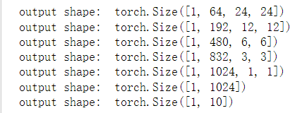 b1 = nn.Sequential(nn.Conv2d(1,64,kernel_size=7,stride=2,padding=3), nn.ReLU(), nn.MaxPool2d(kernel_size=3,stride=2,padding=1)) b2 = nn.Sequential(nn.Conv2d(64,64,kernel_size=1), nn.Conv2d(64,192,kernel_size=3,padding=1), nn.MaxPool2d(kernel_size=3,stride=2,padding=1)) b3 = nn.Sequential(nn.Conv2d(64,64,kernel_size=1), nn.Conv2d(64,192,kernel_size=3,padding=1), nn.MaxPool2d(kernel_size=3,stride=2,padding=1)) b4 = nn.Sequential(Inception(480, 192, (96, 208), (16, 48), 64), Inception(512, 160, (112, 224), (24, 64), 64), Inception(512, 128, (128, 256), (24, 64), 64), Inception(512, 112, (144, 288), (32, 64), 64), Inception(528, 256, (160, 320), (32, 128), 128), nn.MaxPool2d(kernel_size=3, stride=2, padding=1)) b5 = nn.Sequential(Inception(832, 256, (160, 320), (32, 128), 128), Inception(832, 384, (192, 384), (48, 128), 128), d2l.GlobalAvgPool2d()) net = nn.Sequential(b1, b2, b3, b4, b5, d2l.FlattenLayer(), nn.Linear(1024, 10)) net = nn.Sequential(b1, b2, b3, b4, b5, d2l.FlattenLayer(), nn.Linear(1024, 10)) X = torch.rand(1, 1, 96, 96) for blk in net.children(): X = blk(X) print('output shape: ', X.shape)