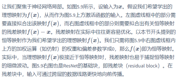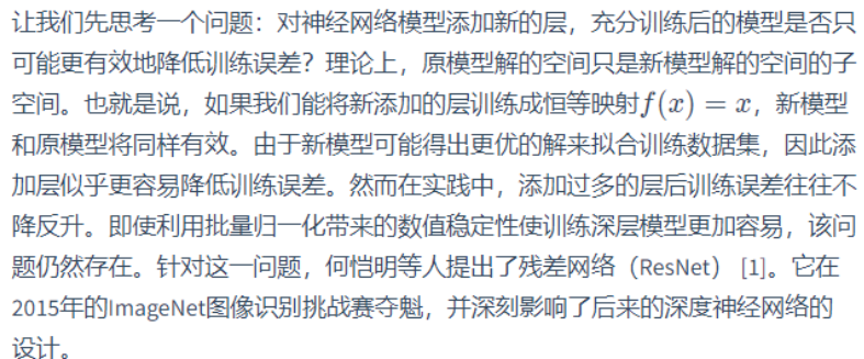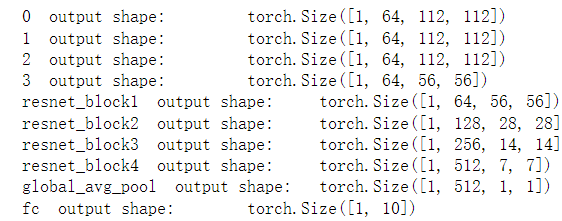 net = nn.Sequential(nn.Conv2d(1,64,kernel_size=7,stride=2,padding=3), nn.BatchNorm2d(64), nn.ReLU(), nn.MaxPool2d(kernel_size=3,stride=2,padding=1)) def resnet_block(in_channels,out_channels,num_residuals,first_block=False): if first_block: # 第一个模块的通道数同输入通道数一致 assert in_channels == out_channels blk= [] for i in range(num_residuals): if i == 0 and not first_block: blk.append(Residual(in_channels,out_channels,use_1x1conv=True, stride=2)) else: blk.append(Residual(out_channels,out_channels)) return nn.Sequential(*blk) net.add_module("resnet_block1", resnet_block(64, 64, 2, first_block=True)) net.add_module("resnet_block2", resnet_block(64, 128, 2)) net.add_module("resnet_block3", resnet_block(128, 256, 2)) net.add_module("resnet_block4", resnet_block(256, 512, 2)) net.add_module("global_avg_pool", d2l.GlobalAvgPool2d()) # GlobalAvgPool2d的输出: (Batch, 512, 1, 1) net.add_module("fc", nn.Sequential(d2l.FlattenLayer(), nn.Linear(512, 10))) X = torch.rand((1, 1, 224, 224)) for name, layer in net.named_children(): X = layer(X) print(name, ' output shape:\t', X.shape)