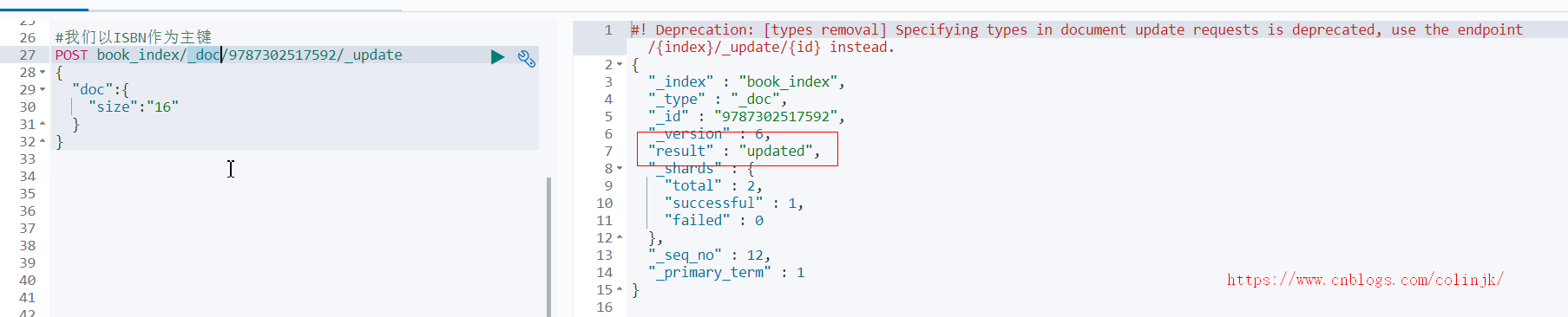 语法:POST 索引名/type名/主键/_update (此方法在新的ES里已经过期)