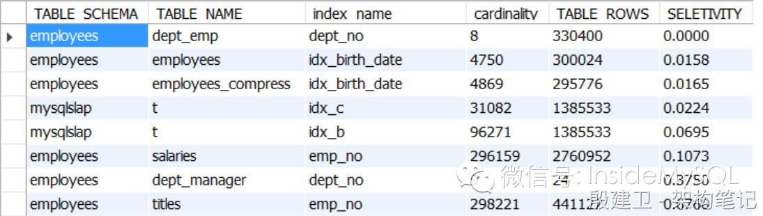 - 表 STATISTICS 记录了各个索引的 CARDINALITY 值。