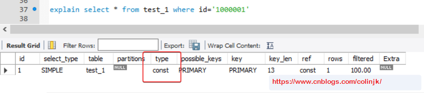 首先,我们使用正确的格式查询,可以看到正常走索引,而且是const 类型