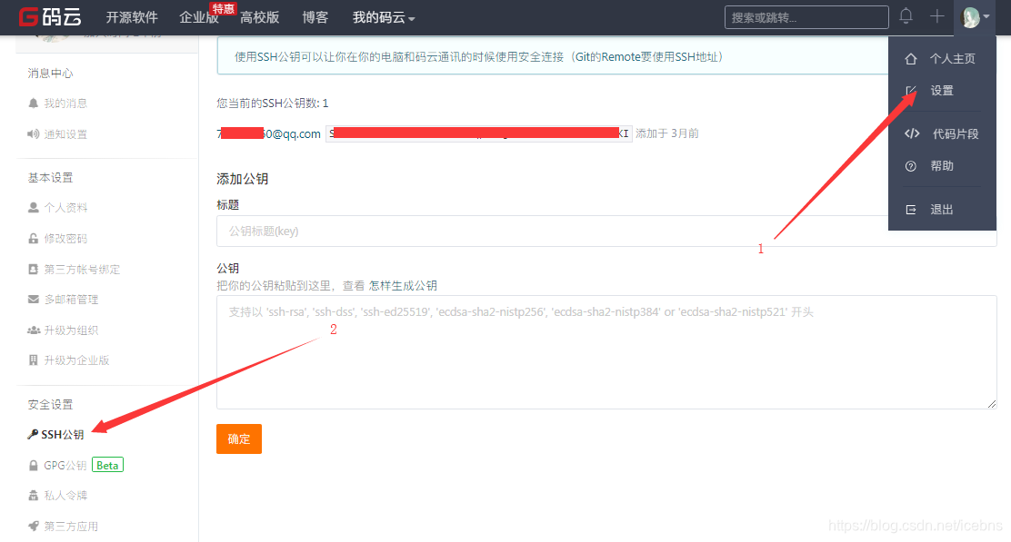 第2步:进入码云官网,登录后 选择“设置”--“SSH公钥”