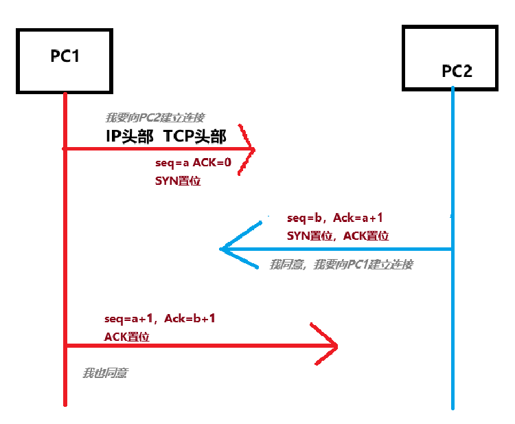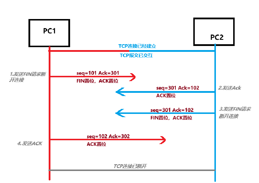 PC1发起了请求,PC2做出回应,但由于自身的业务并未完成,直到完成,PC2才会发送断开的请求。