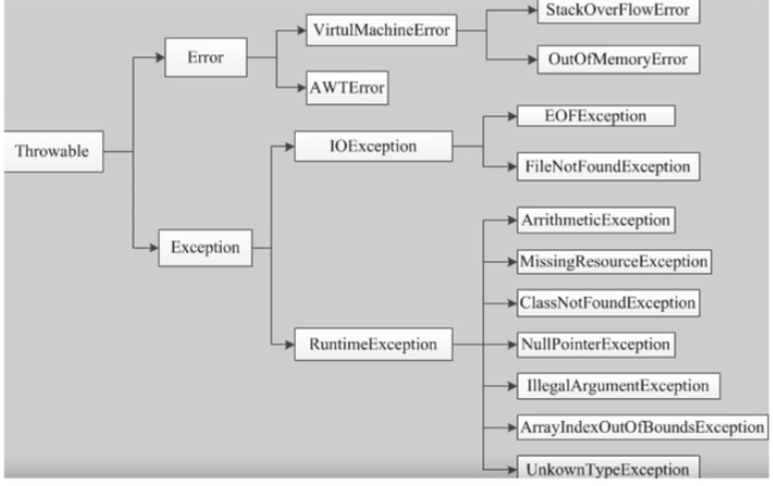 Error:由Java虚拟机生成并抛出,大多数错误与代码编写者所执行的操作无关,错误不是异常,是脱离程序员控制的问题,编译也检查不到,如栈溢出