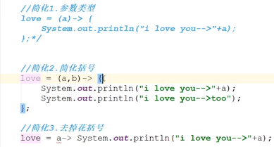 public class LambdaTest { //静态内部类 static class Like2 implements ILike{ @Override public void lambda() { System.out.println("I like java,too!"); } } public static void main(String[] args) { ILike like = new Like(); like.lambda(); //2、静态内部类 like = new Like2(); like.lambda(); //3、局部内部类 class Like3 implements ILike{ @Override public void lambda() { System.out.println("I like java,too too!"); } } like = new Like3(); like.lambda(); //4、匿名内部类,没有名称,必须借助接口或者父类 like = new ILike() { @Override public void lambda() { System.out.println("I like java,too too too!"); } }; like.lambda(); //5、lambda简化 like = ()->{ System.out.println("I like java,too too too too!"); }; like.lambda(); } } //定义一个函数式接口 interface ILike{ void lambda(); } //1、实现类 class Like implements ILike{ @Override public void lambda() { System.out.println("I like java"); } }