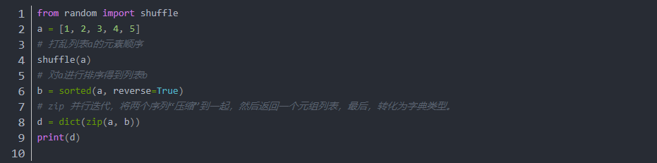 将列表a的元素顺序打乱,再对a进行排序得到列表b,然后把a和b按元素顺序构造一个字典d。