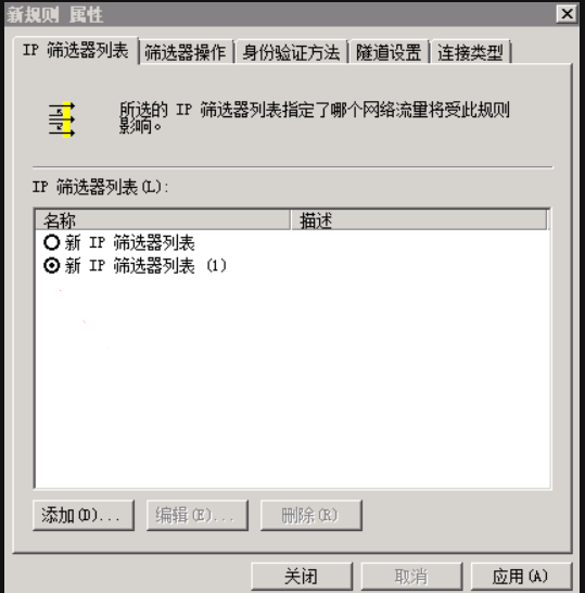 最后在新IP安全策略属性对话框中,把我们刚新建的IP筛选器列表前的复选框选中,点击确定。