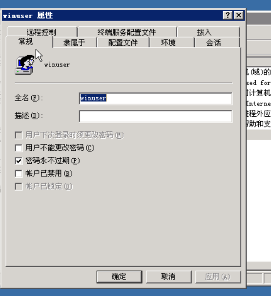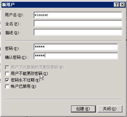 添加一个用户WinUser,并给该用户设置一个密码,本实验使用的密码是admin,密码可随意设置,但是需要记住,在后面需要用到,把用户下次登录时须更改密码前面的勾选去掉