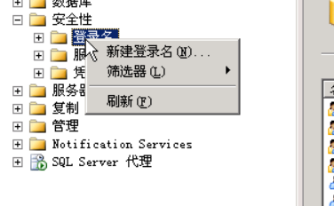 右击“登录名”按钮,在弹出的快捷菜单中选择“新建登录”。