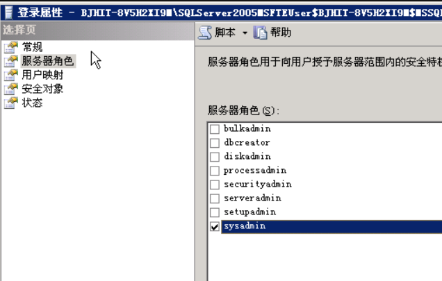 3)选择“服务器角色”选项卡。可以在服务器角色列表框中选择相应的服务器角色成员。在这里,设置登录用户winuser的服务器角色为系统管理员。