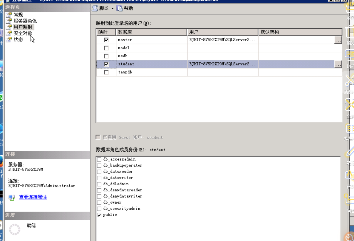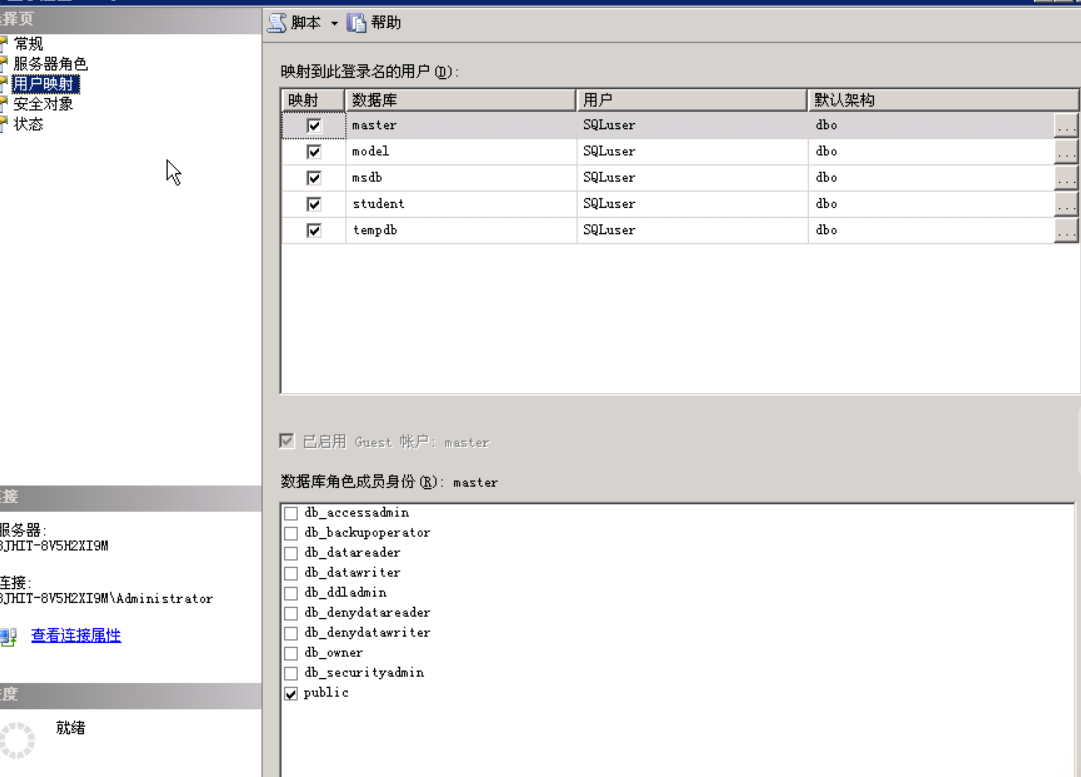 4)选择“用户映射”选项卡,在列表框中列出了该账号可以访问的数据库,如果单击数据库左边的复选框,表示该用户可以访问相应的数据库。在这里,选中数据库master和student左边的复选框,表示登陆用户winuser可以访问的数据库为master和student。在下方的数据库角色成员身份都选择public。然后点击确定。