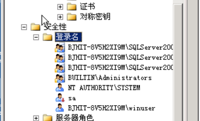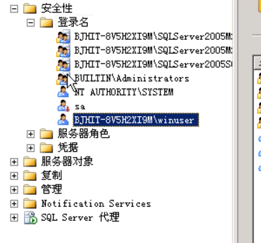 在对象资源管理器中,展开安全性-登录名,可以看到winuser已存在。
