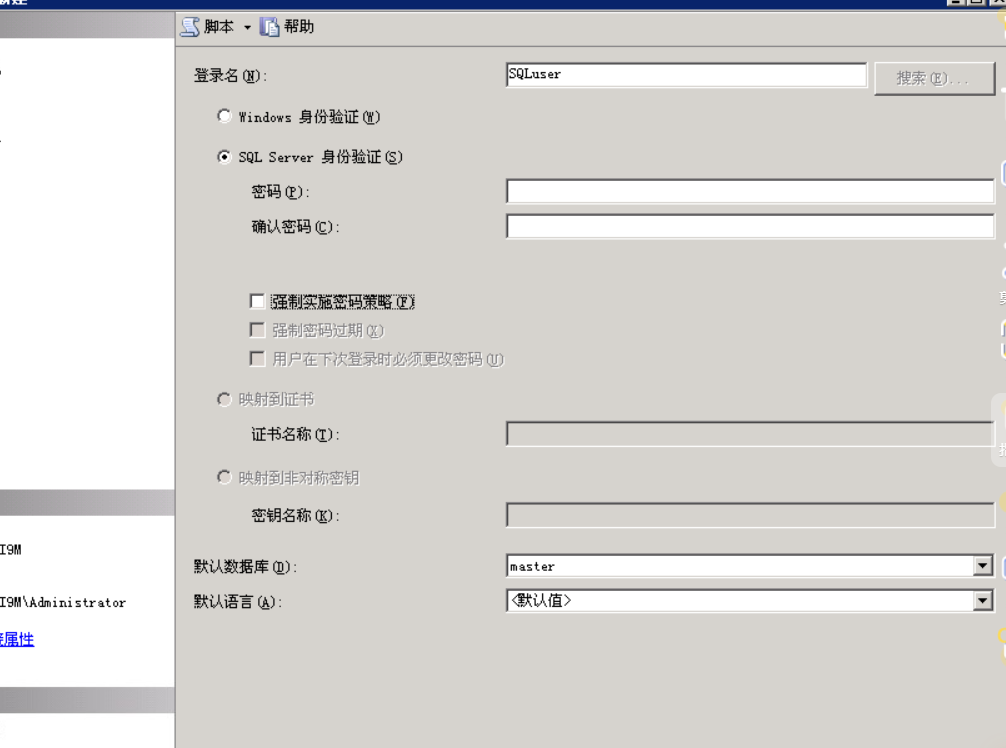 在 SQL Server Management Studio中,展开实例下的“安全性”,右击“登录名”按钮,在弹出的快捷菜单中选择“新建登录”(参考前面新建登录步骤),在登录名输入框内输入需要新建的用户名,这里新建的用户名是SQLUser。验证方式选择SQL Server身份验证,然后在密码框输入SQLUser的密码。这里设置成test。把强制实施密码策略的复选框去勾选去掉,默认数据库选择master,然后点击确认。