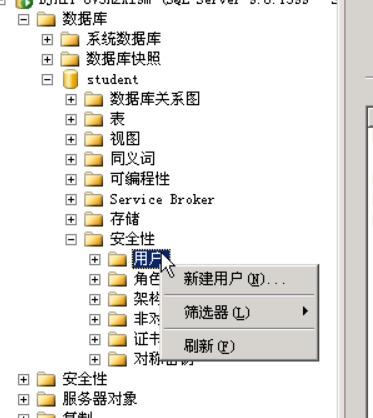 1)创建数据库用户 打开SQL Server Management Studio,展开服 务器-数据库,选择要创建用户的数据库,如student,展开student,用鼠标右键单击“安全性”节点,从弹出的菜单中选择“新建-用户”命令。