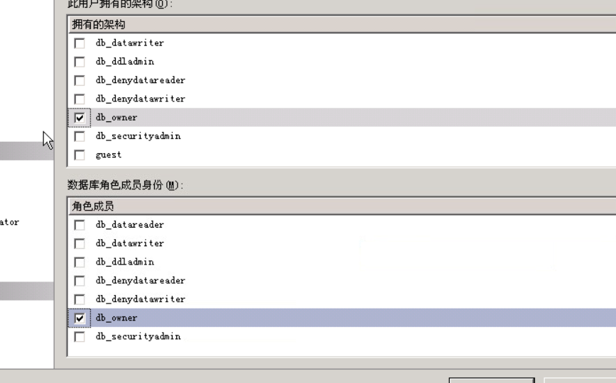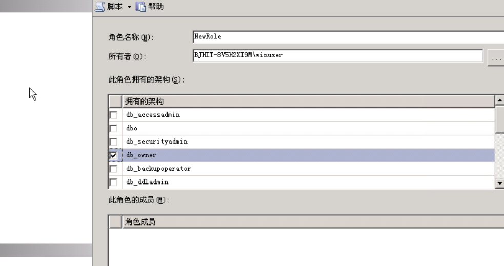 在此角色拥有的架构中选择db_owner,然后点击确定,完成角色创建。