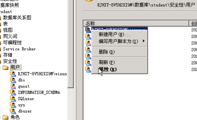 同时,展开数据库-系统数据库-student-安全性-用户,在用户列表中可以看到数据库student中已经建立一个数据库用户winuser。
